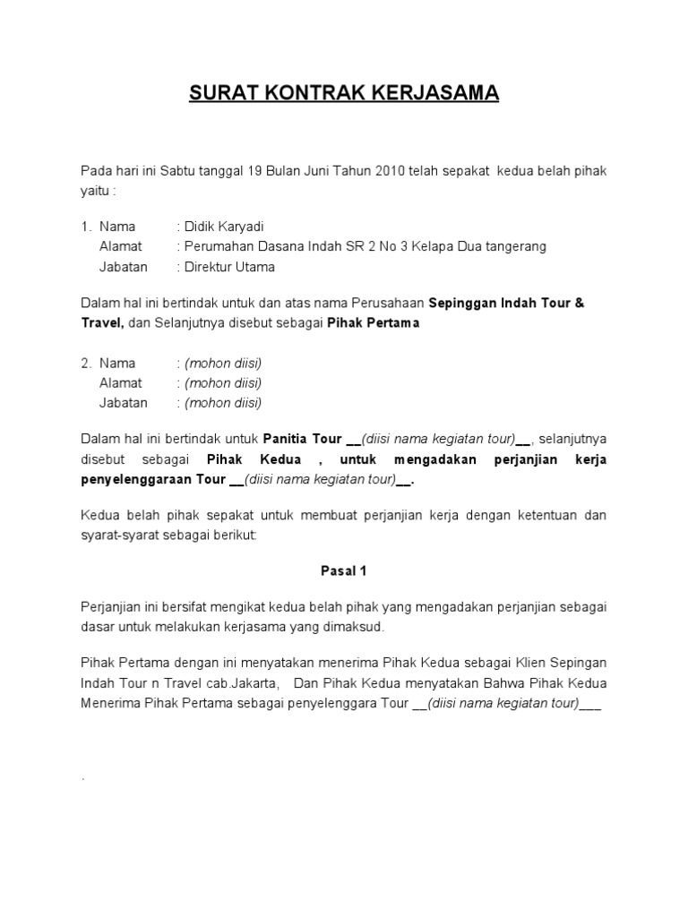 3506170800005 tempat tanggal lahir : Bentuk kerjasama adalah pemberian pekerjaan di mana pihak pertama dengan ini memberikan pekerjaan kepada pihak kedua. Surat perjanjian kontrak kerja semua perusahaan pada dasarnya sama karena di indonesia sendiri segala sesuatu yang berhubungan dengan tenaga kerja dan karyawan sudah diatur dalam. Surat perjanjian kerjasama para pihak yang bertanda tangan di bawah ini: Kerjasama yang satu ini sudah sangat bahwa segala sesuatu yang berkaitan dengan kontrak ini dengan segala akibatnya, maka para.