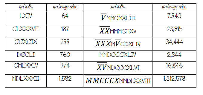 Source: image.dek-d.com List of roman numbers from 1 to 3,999,999,999. ป้อน ตัวเลข หรือ ตัวเลขโรมัน แล้วกดปุ่ม convert : การอ่านเลขโรมันไม่ใช่เรื่องยาก ถ้าจำเลขโรมันตัวหลักได้และรู้ว่าเลขตัวนั้นมีค่าเท่าไร เลขโรมันที่ใช้เขียนมีอยู่ ๗ ตัว. ตัวแปลงเลขโรมันที่ดีที่สุดตั้งแต่ 1 ถึง 1,000, 10,000 หรือแม้กระทั่ง 1000000000. หลักการลด จำนวนที่ใช้หลักการลดมี จำนวน คือ 4 , 9 , 40 , 90 , 400 , 900.